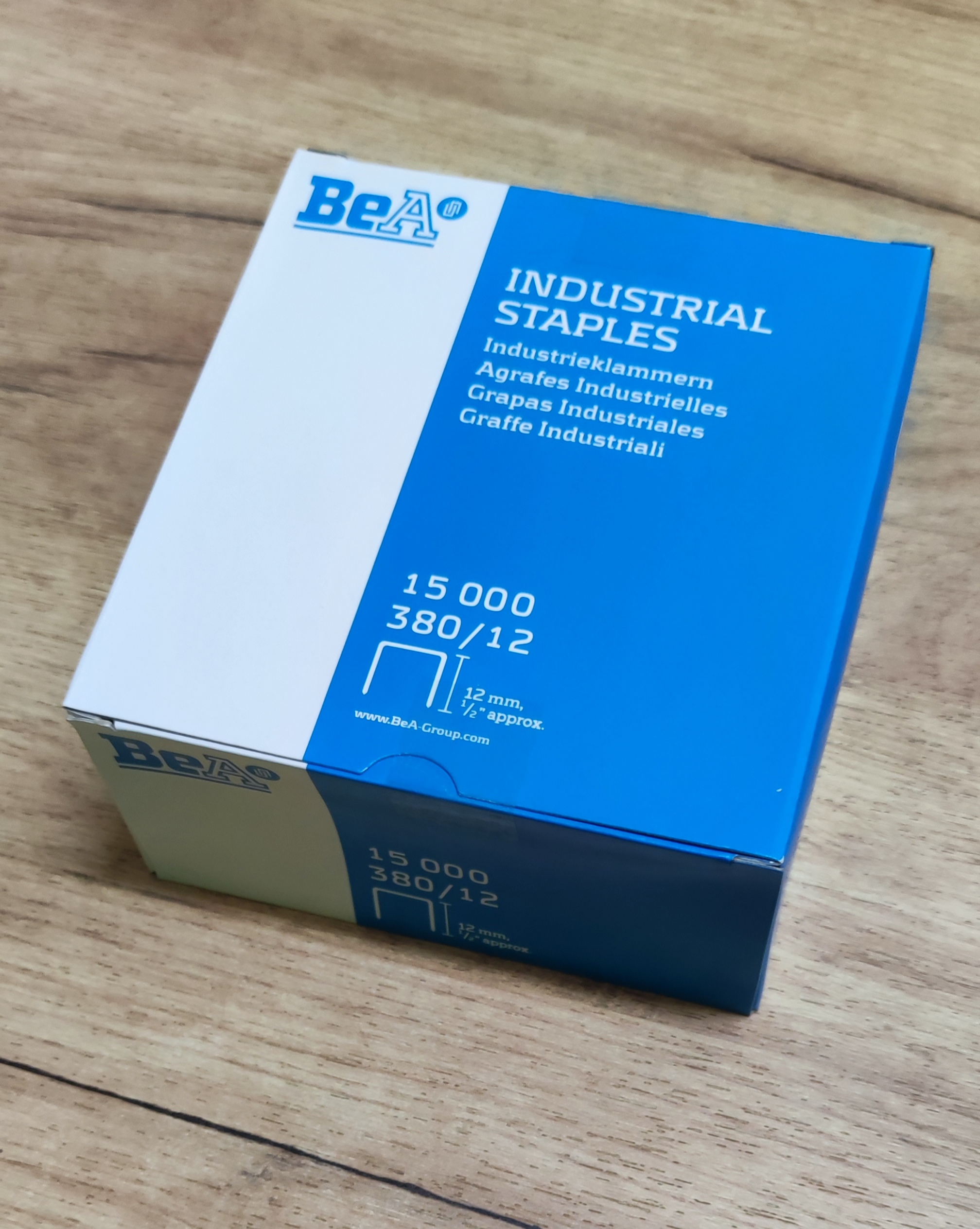 Čalúnnické spony BeA 380/12 (80/12), ktoré sa používajú na čalúnenie nábytku, pripevňovanie textilu, koží, fólií, papiera a lepenky, tenkých izolácií a podobne